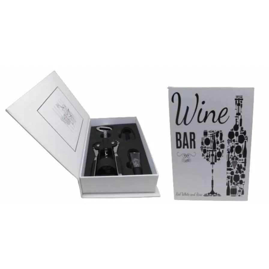Especificações do Produto: Kit Vinho Abridor Saca Rolhas Tampa Dosador tipo Livro 5 Peças é composto por: